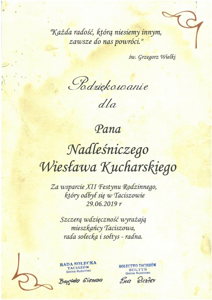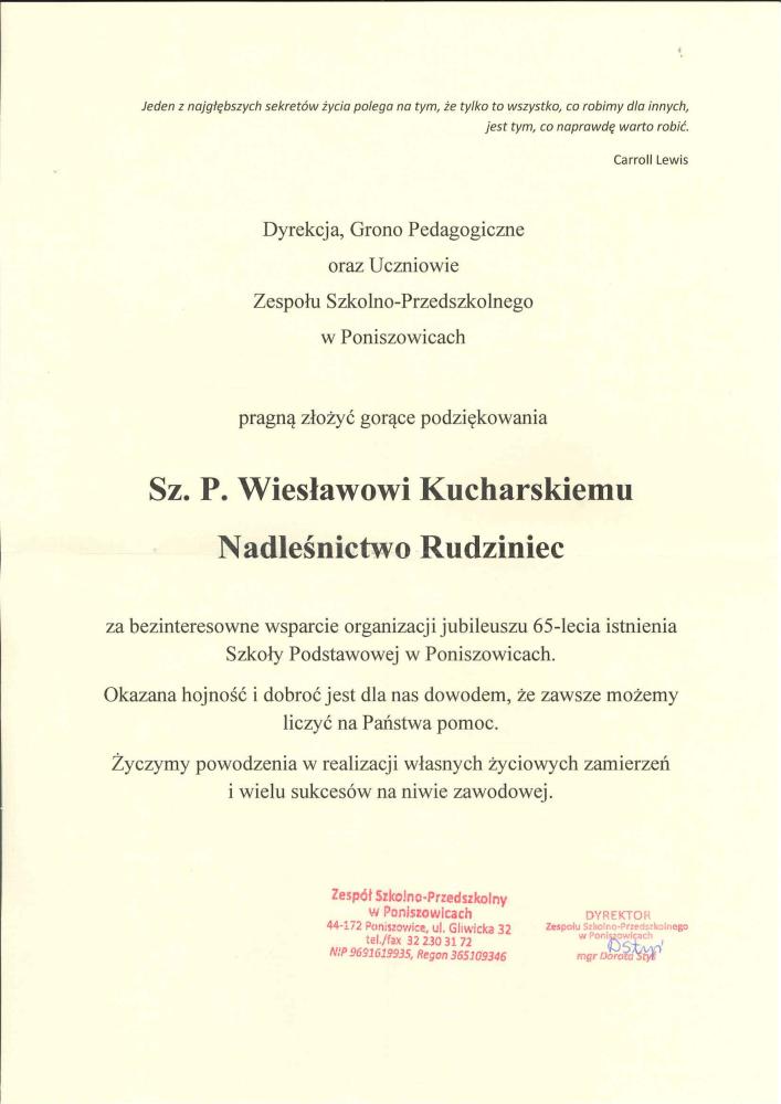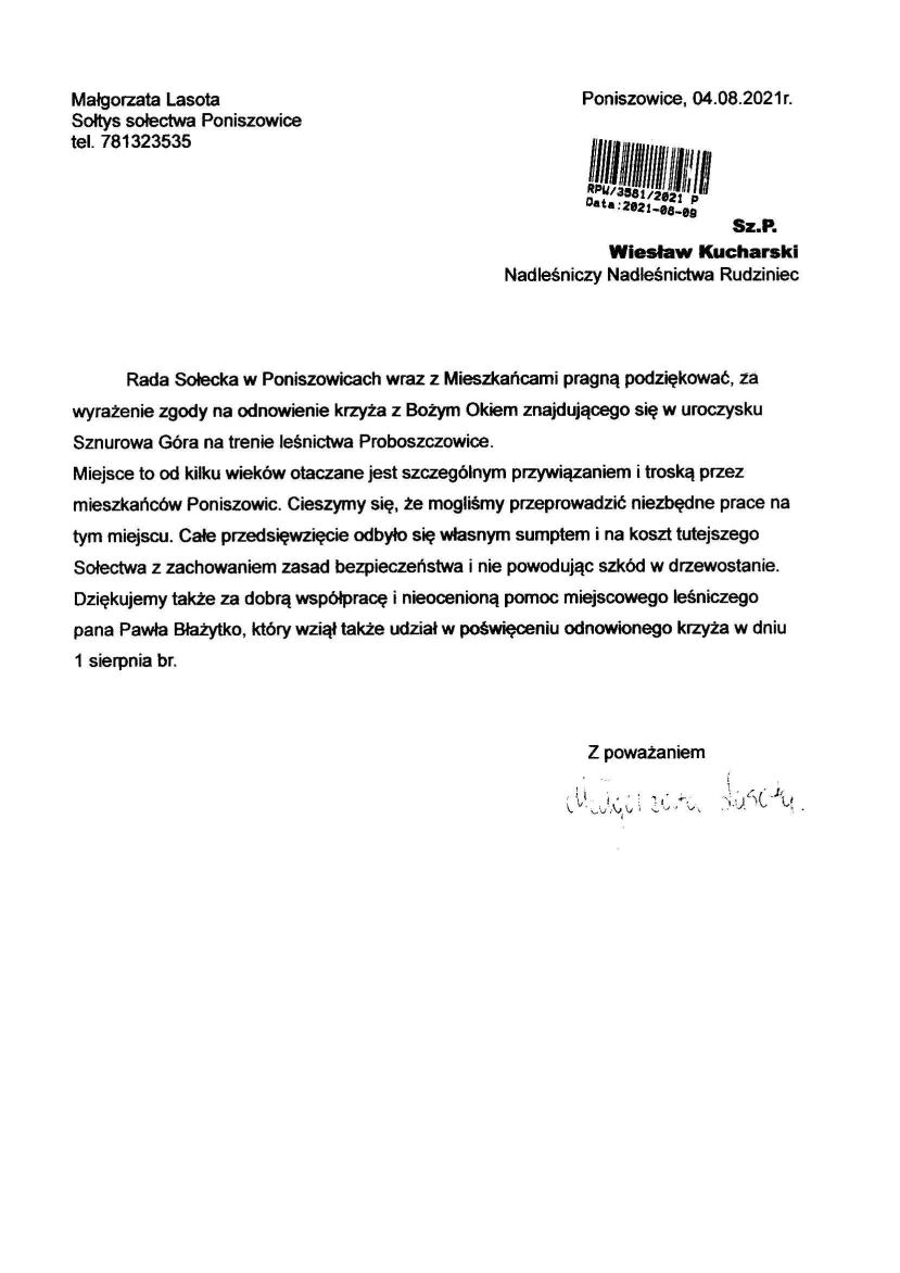 Podziękowanie od Rady Sołeckiej w Poniszowicach za udostępnienie do remontu krzyża z uroczyska Sznurowa Góra na terenie leśnictwa Proboszczowice