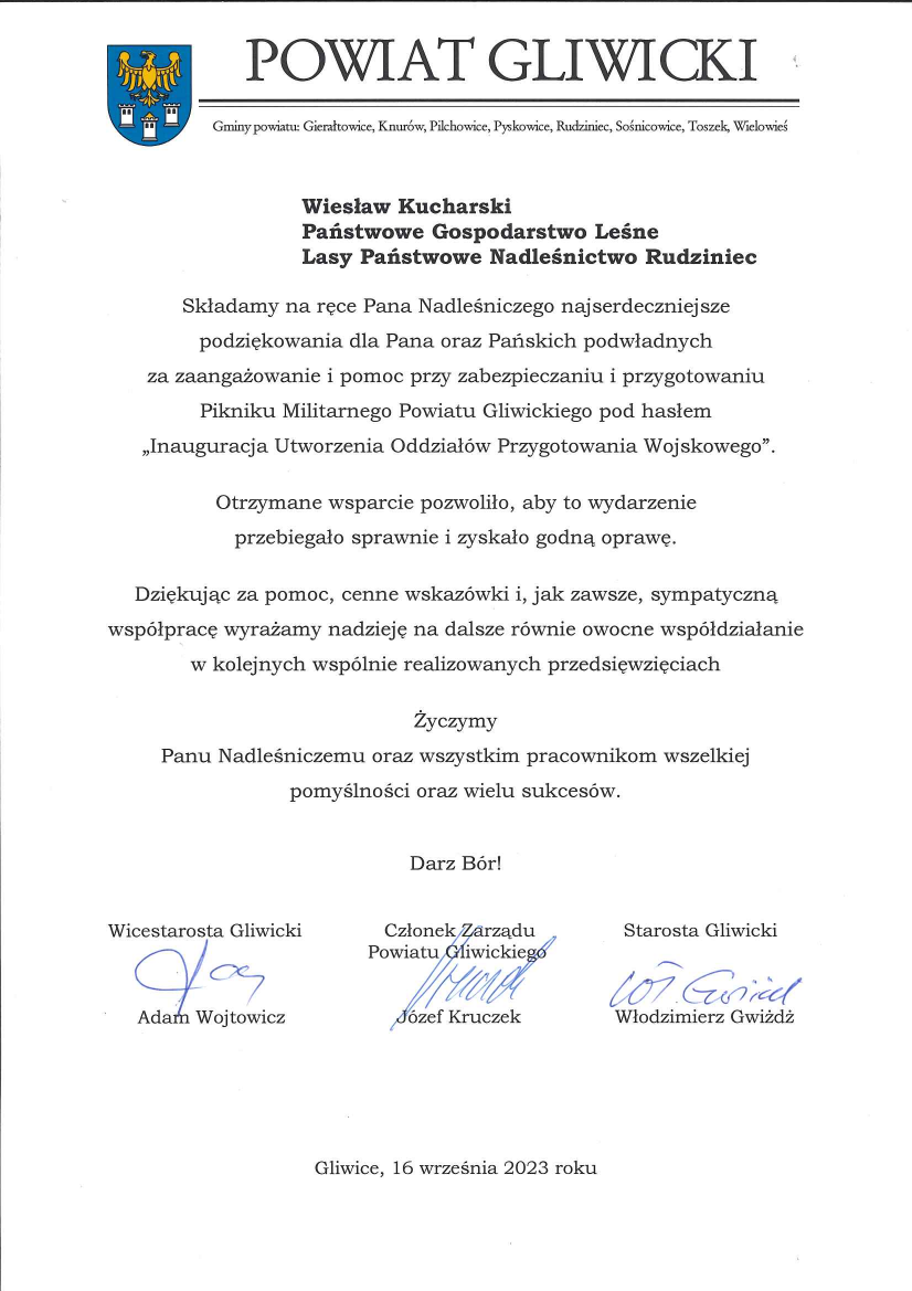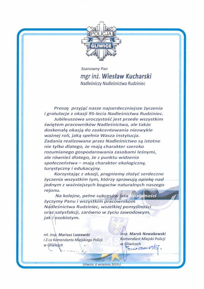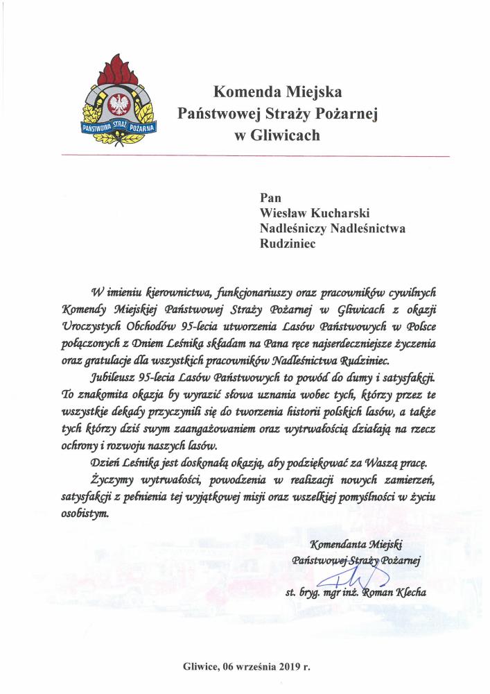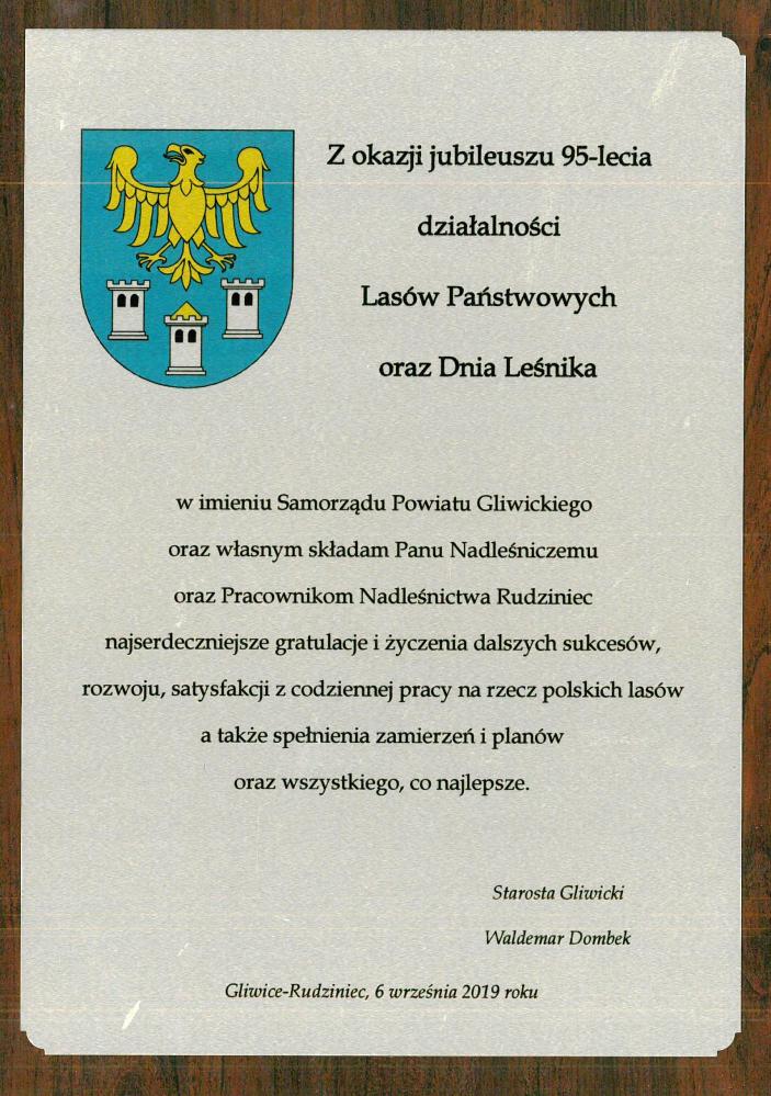 Gratulacje Starostwa Powiatowego Gliwice z okazji 95-lecia LP (wrzesień 2019 r.)