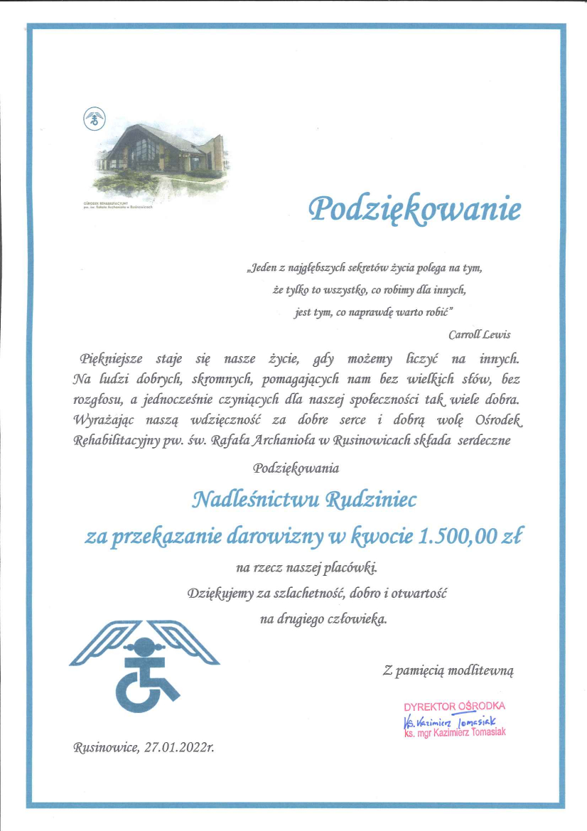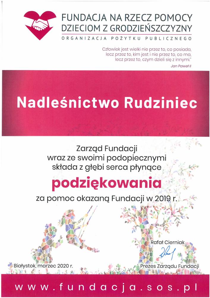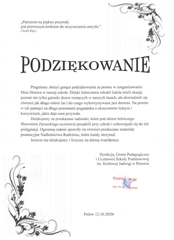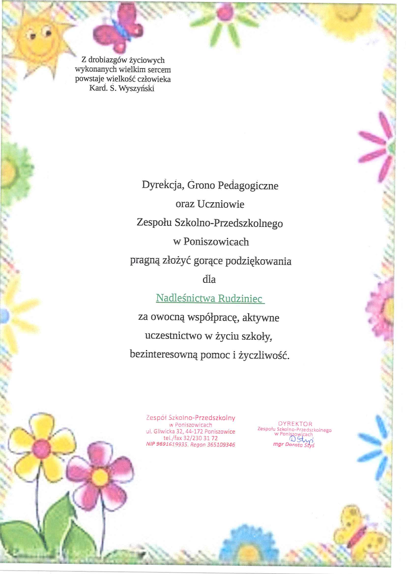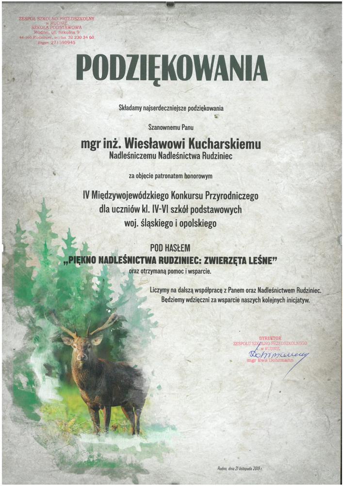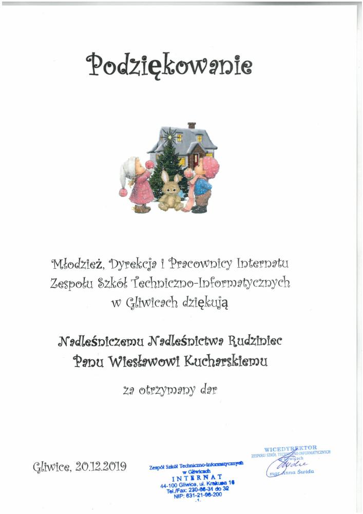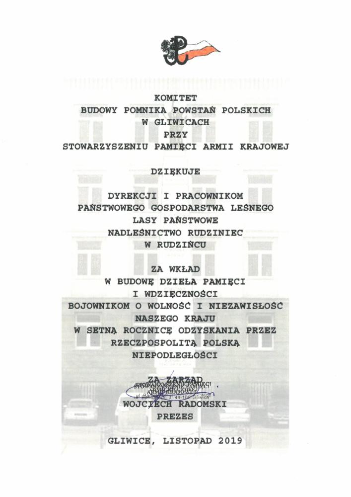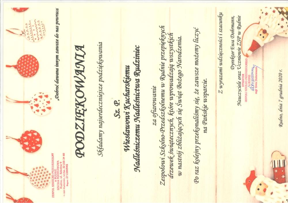 Podziękowanie ZP w Rudnie za pomoc w konkursie "Piękno Nadleśnictwa Rudziniec" (21.11.2019 r.)