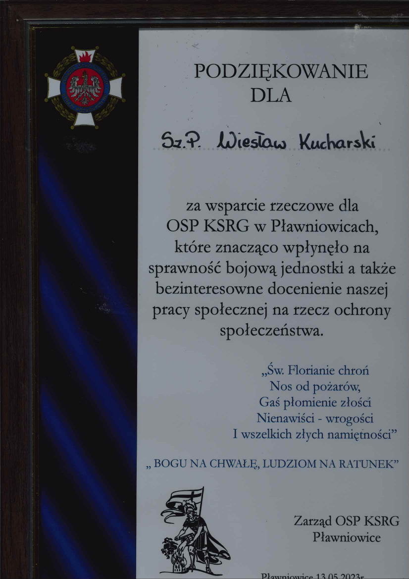 Podziękowanie OSP w Starej Kuźni za wsparcie finansowe