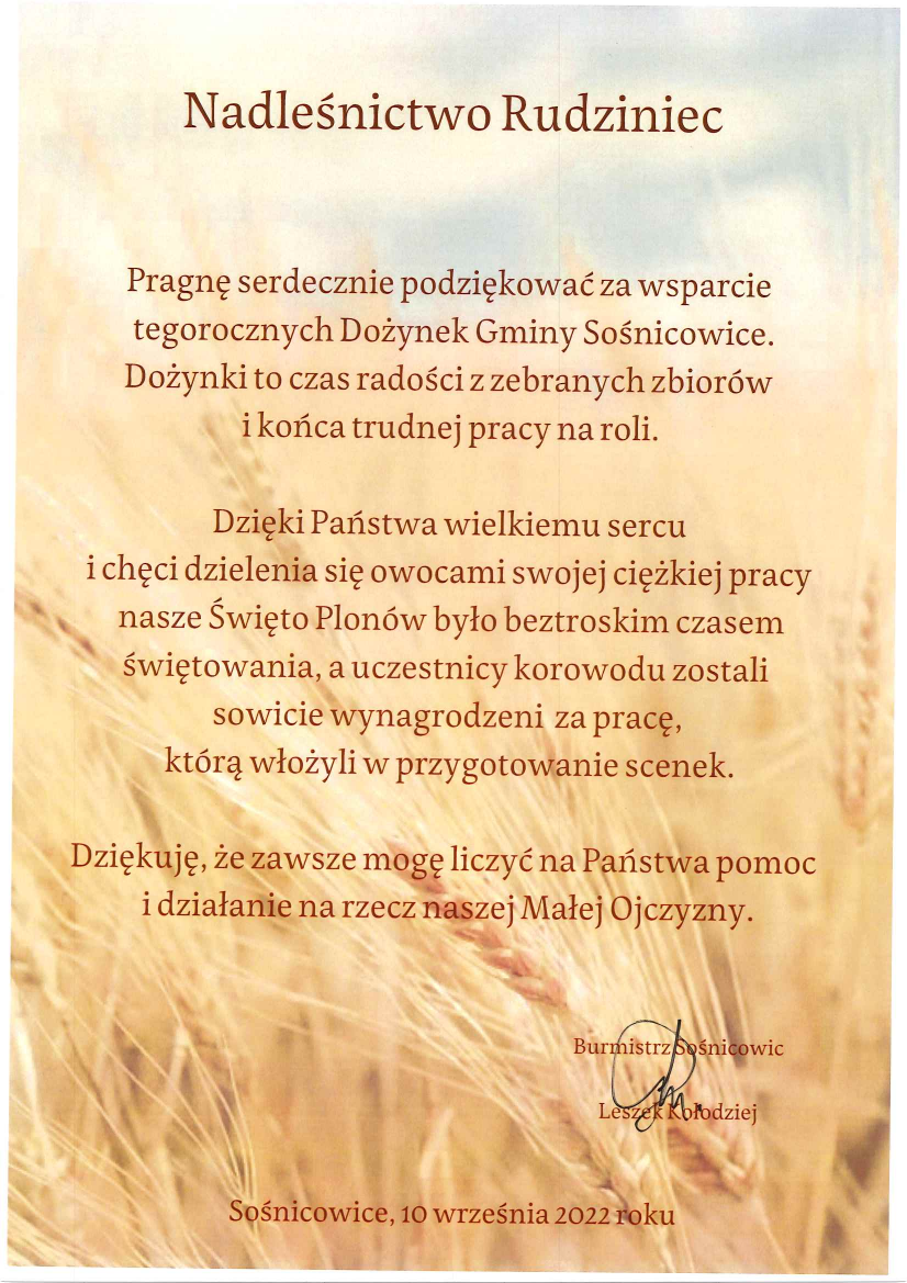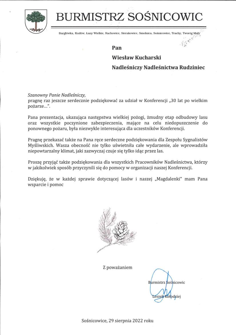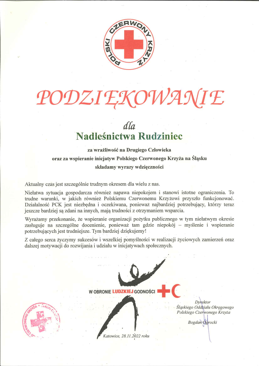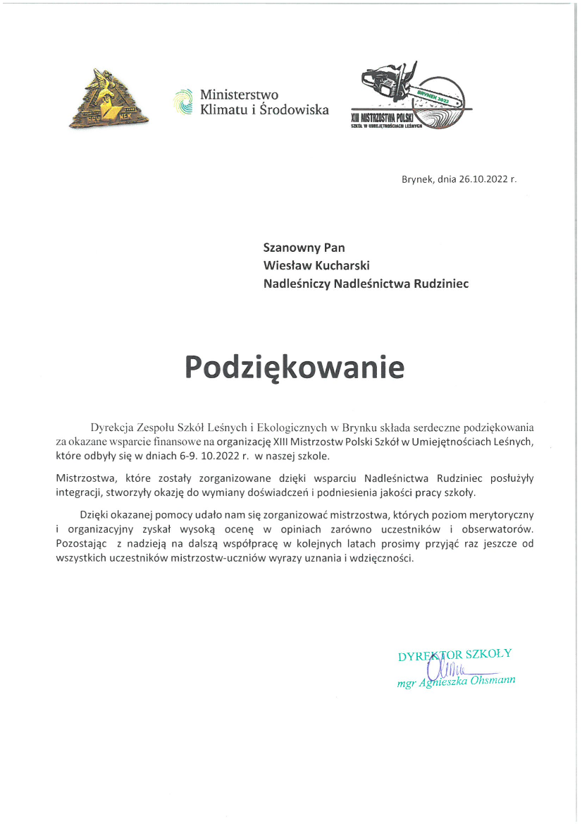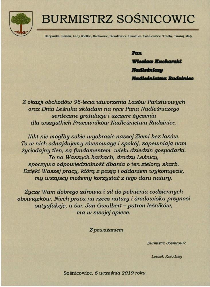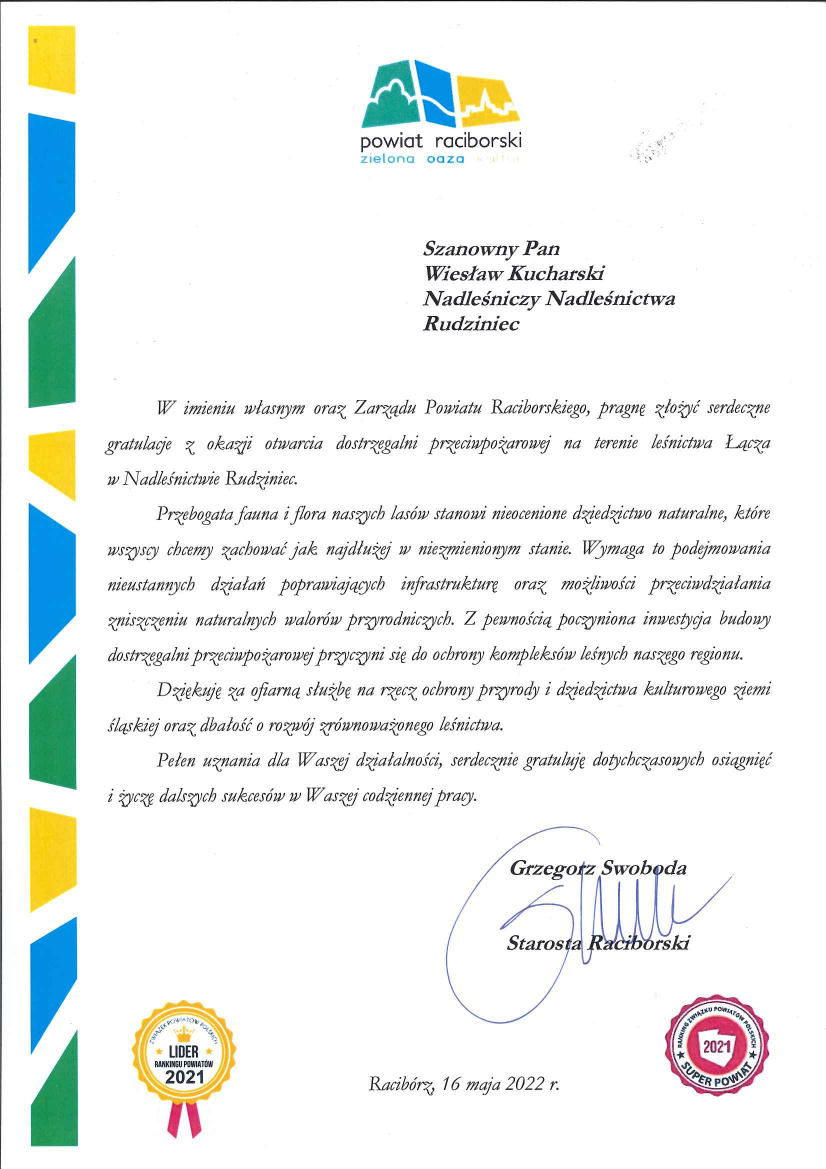 Podziękowania i gratulacje dla Nadleśnictwa Rudziniec