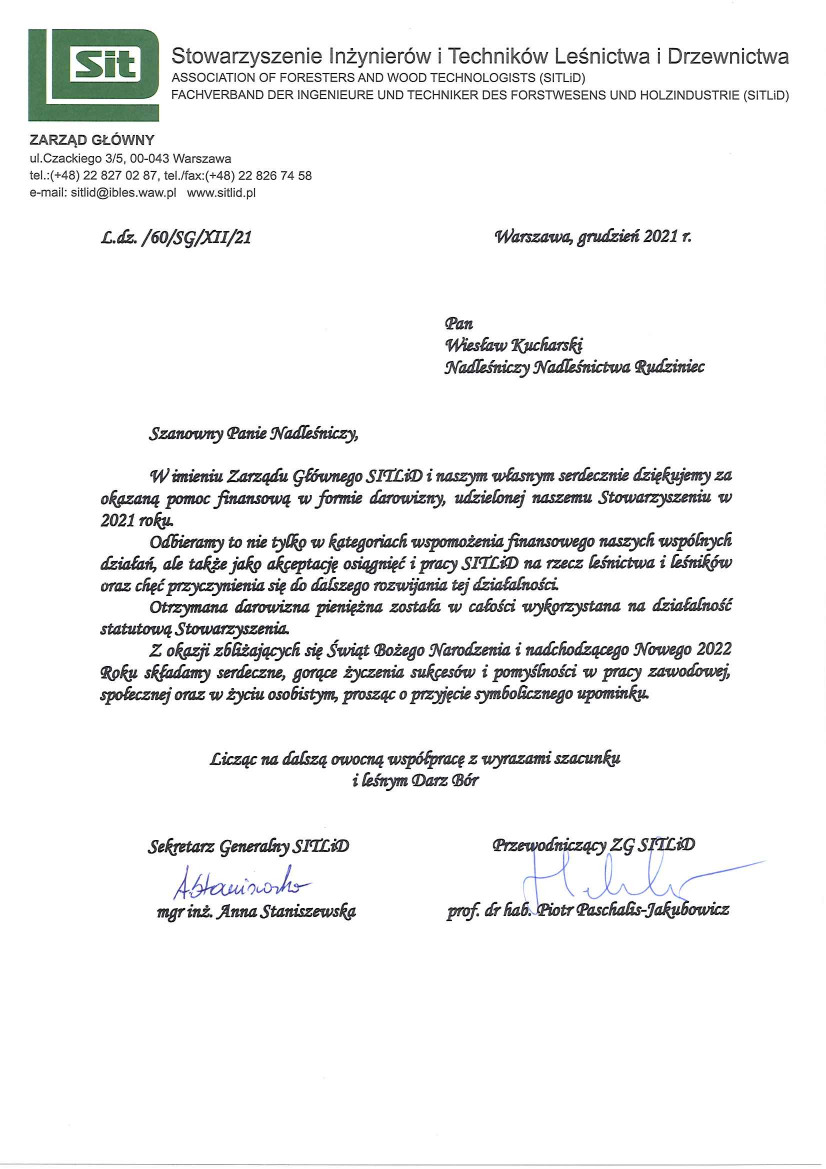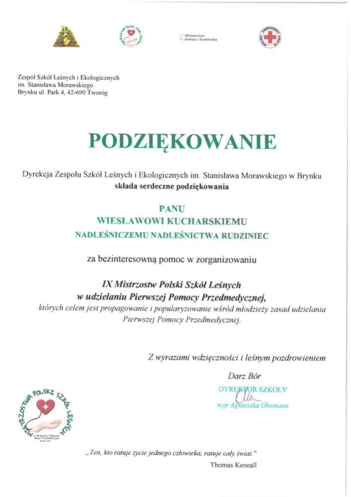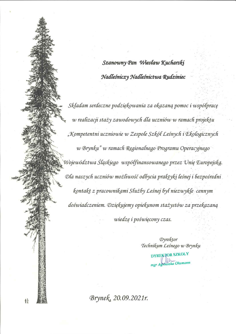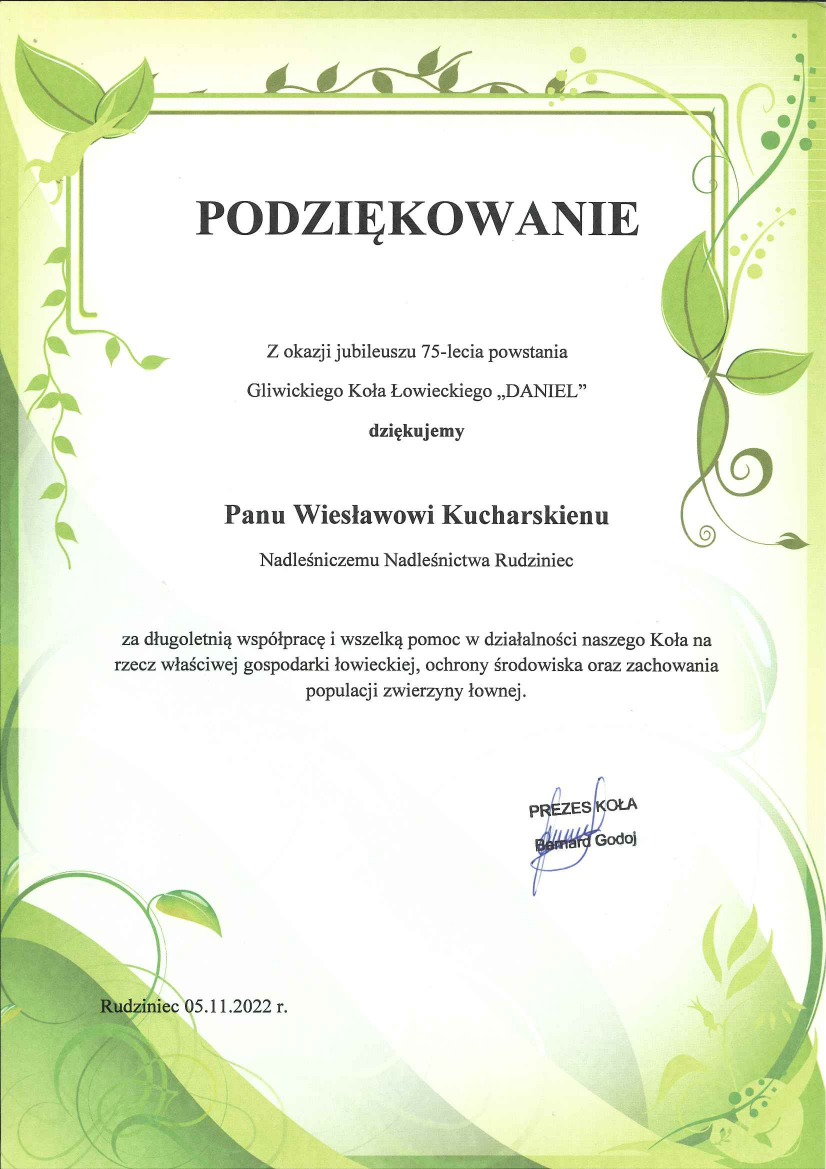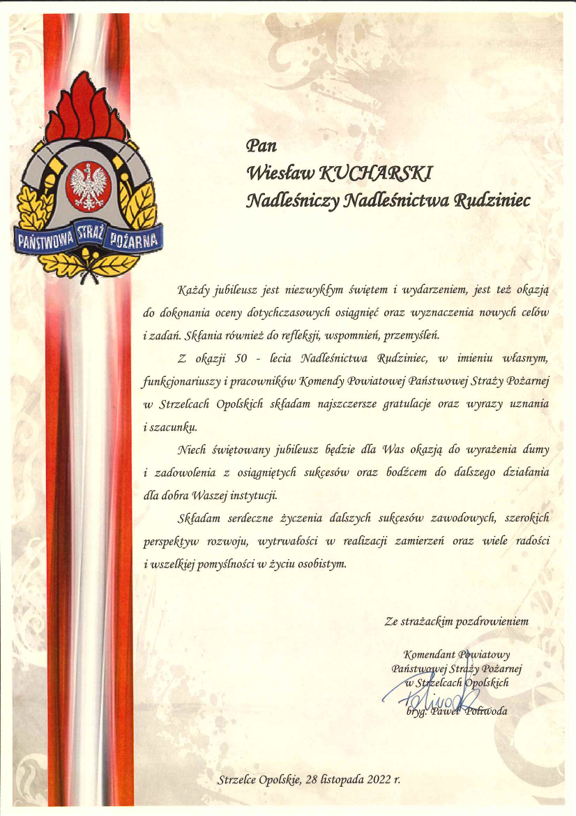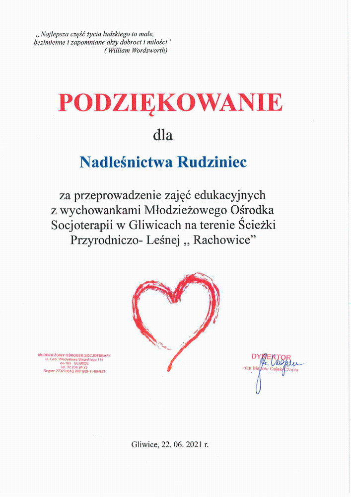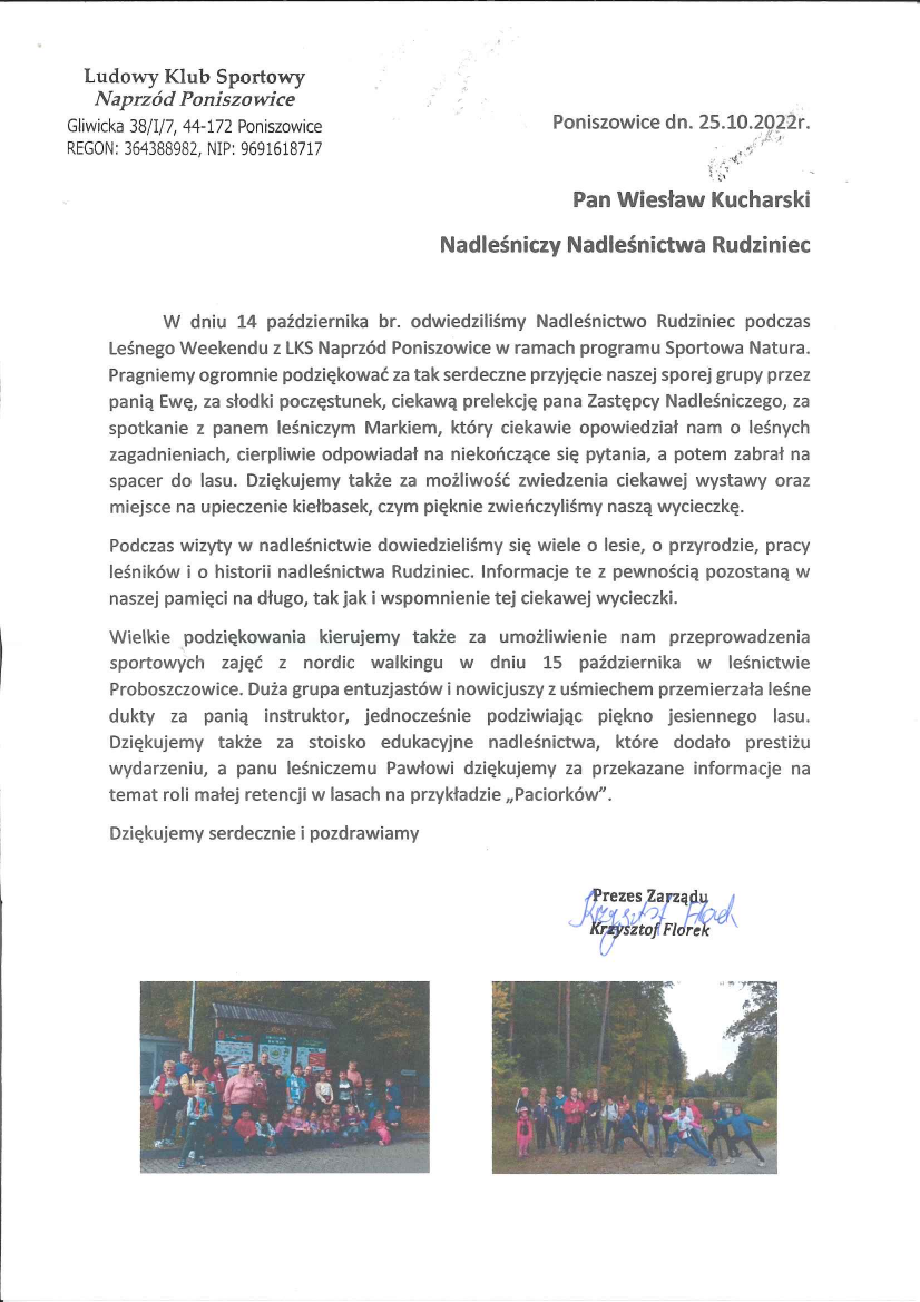 Podziękowania i gratulacje dla Nadleśnictwa Rudziniec