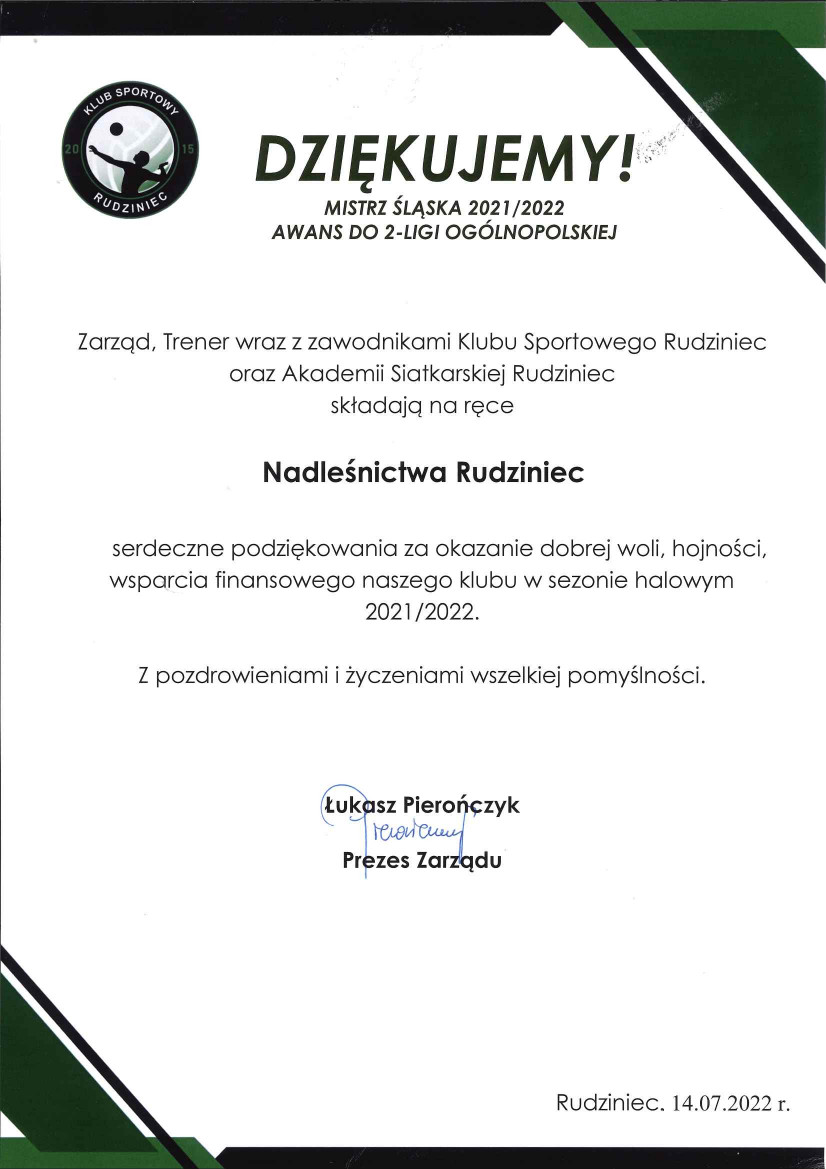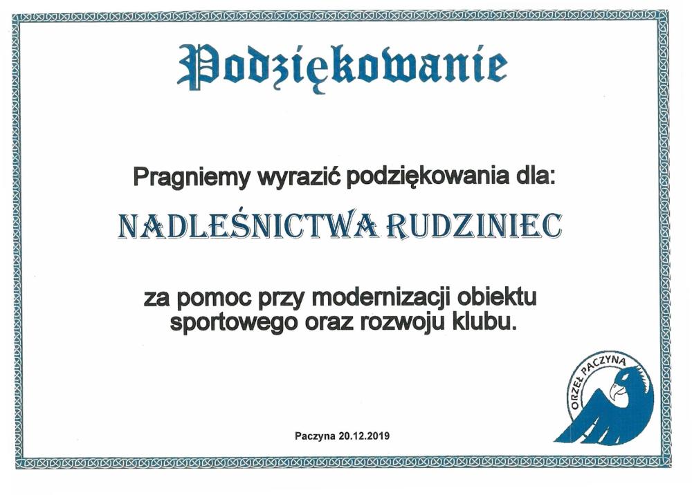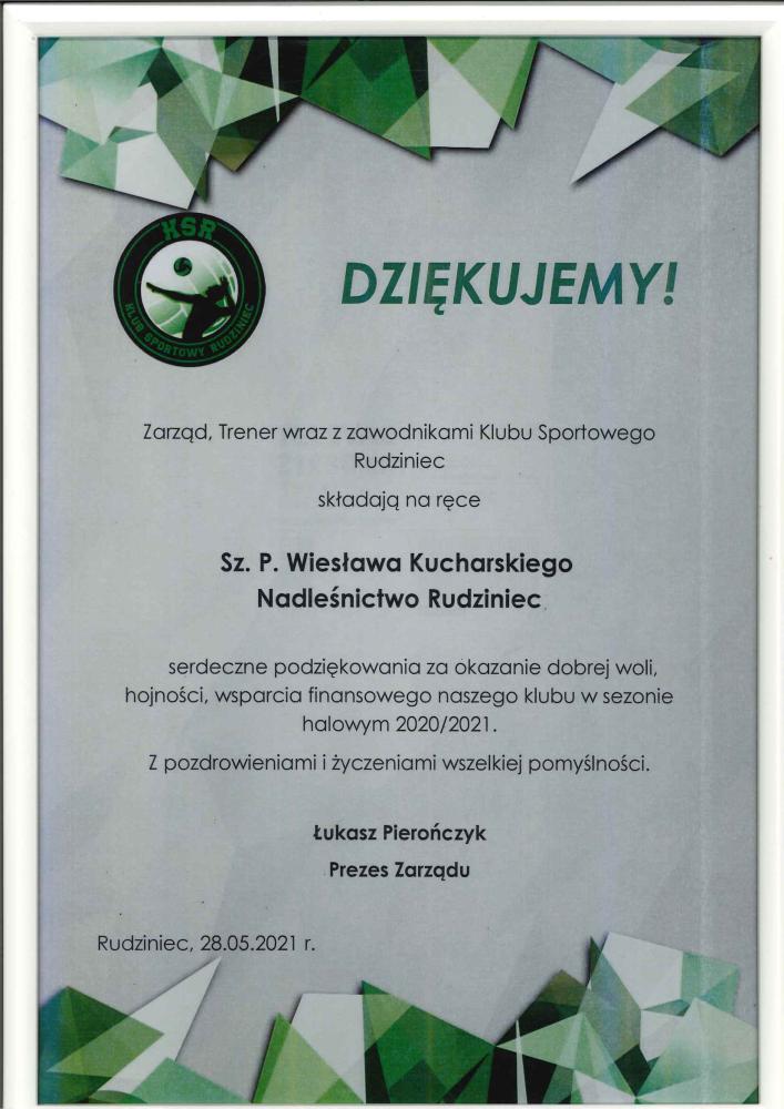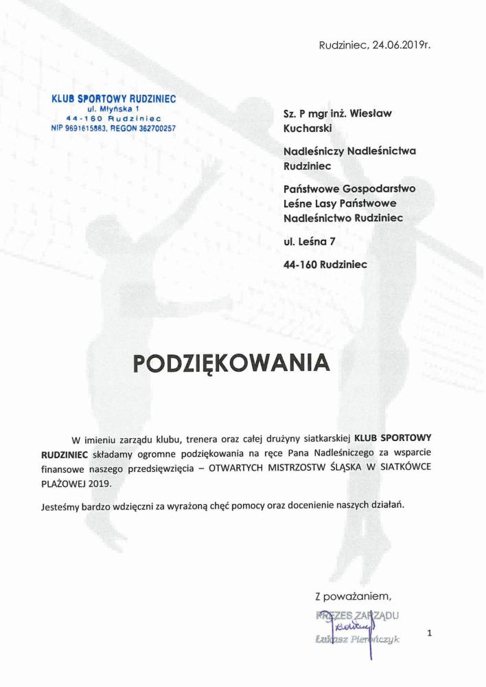 Podziękowanie Klubu Sportowego Rudziniec za wsparcie (czerwiec 2019 r.)
