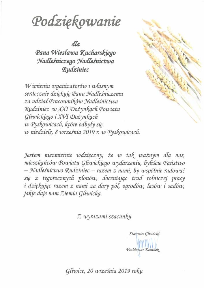 Podziękowania Starosty Gliwickiego za udział w Dożynkach (wrzesień 2019 r.)