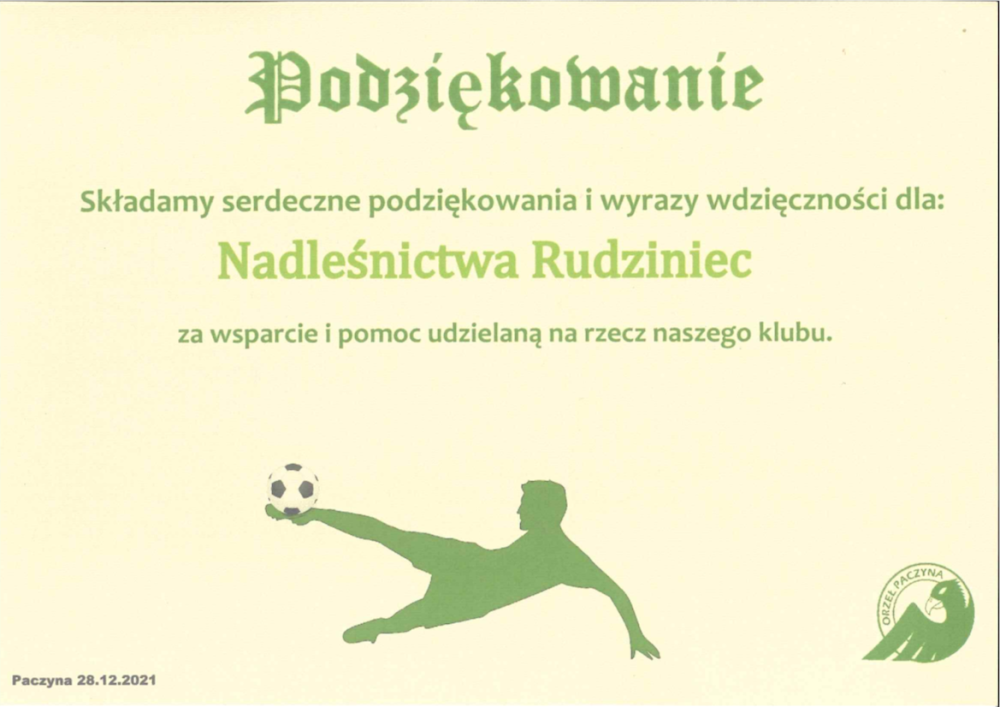 Podziekowanie Klubu Sportowego Orzeł Paczyna na wsparcie