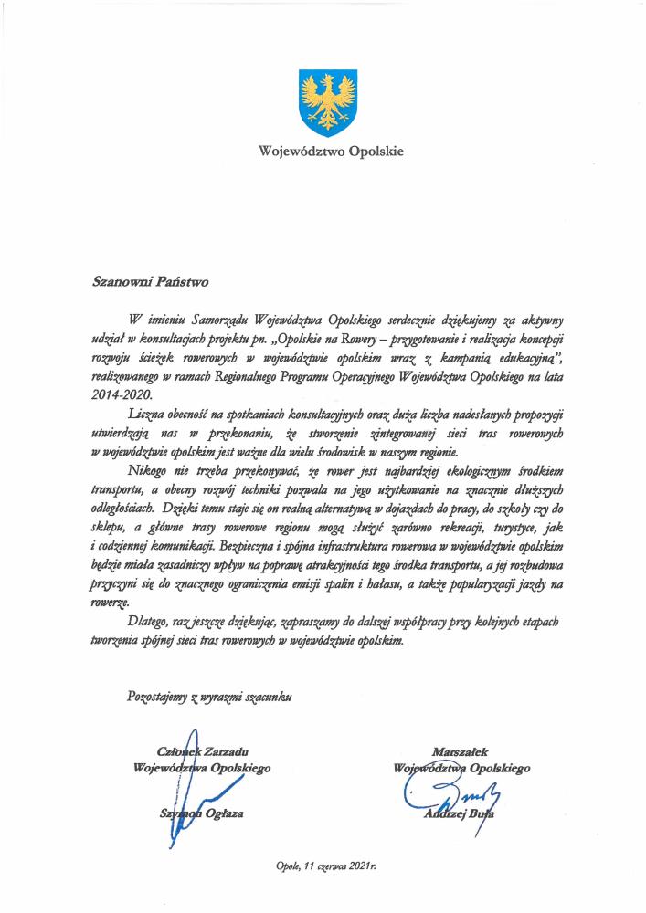 Podziękowanie Marszałka Województwa Opolskiego za udział w konsultacjach projektu Opolskie na rowery