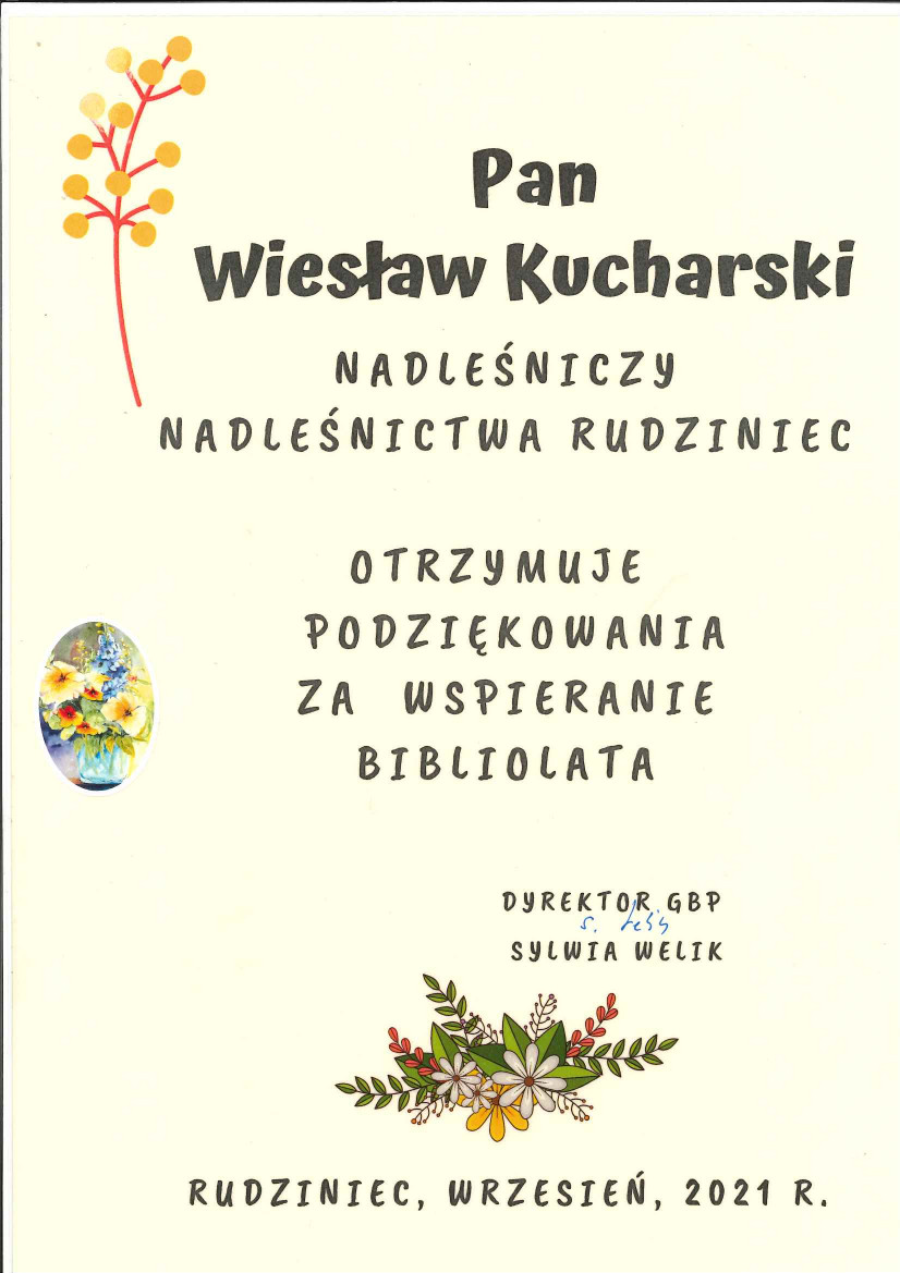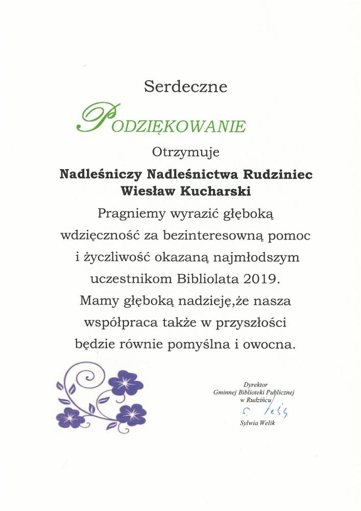 Podziękowanie Gminnej Biblioteki Publicznej w Rudzińcu (2019 r.)