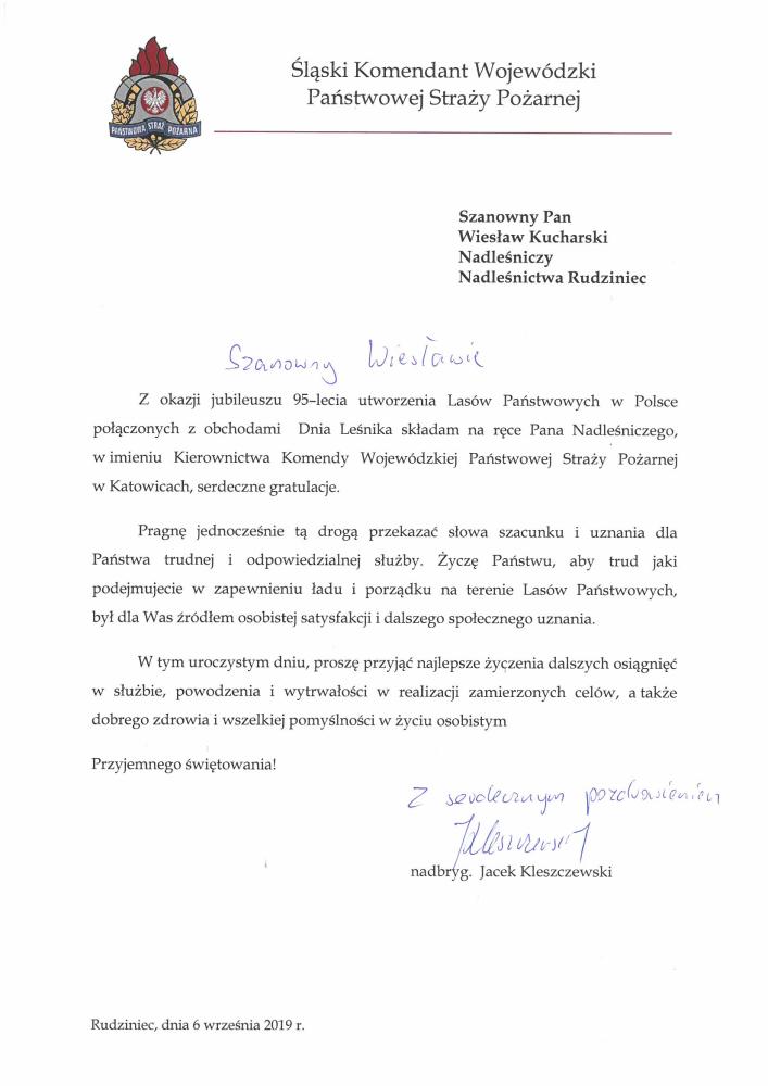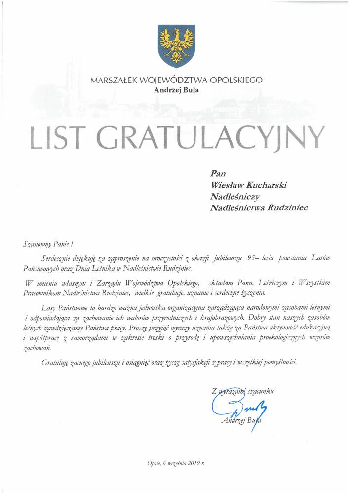 List Gratulacyjny Marszałka Województwa Opolskiego z okazji 95-lecia LP (wrzesień 2019 r.)