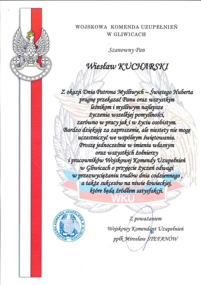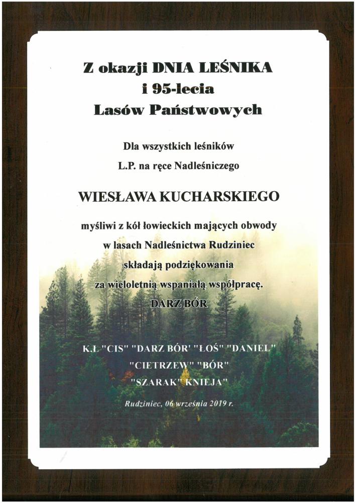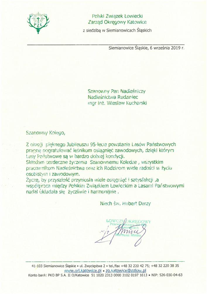 Gratulacje oraz podziękowania Kół Łowieckich z okazji 95-lecia LP (wrzesień 2019 r.)