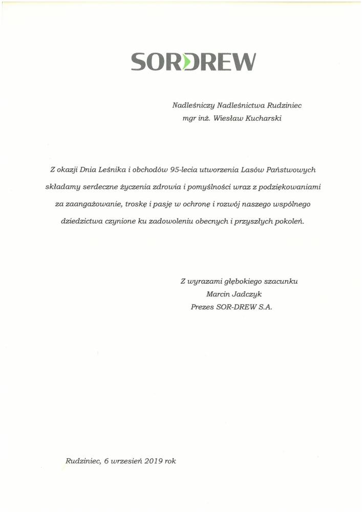 Gratulacje SORDREW z okazji 95-lecia LP (wrzesień 2019 r.)