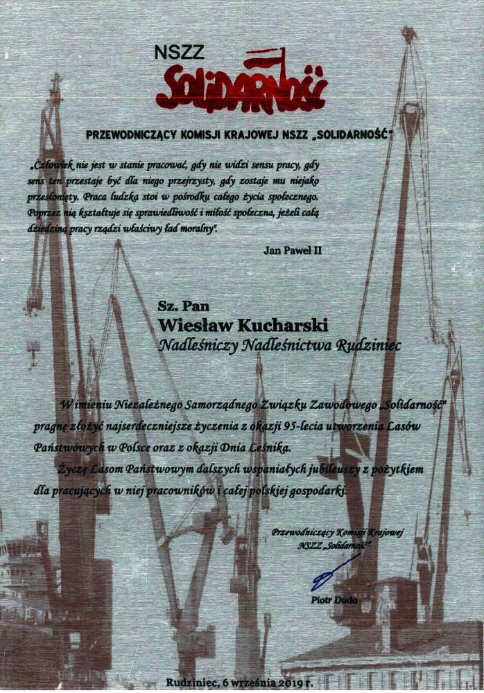 Gratulacje NSZZ "SOLIDARNOŚĆ" z okazji 95-lecia LP (wrzesień 2019 r.)