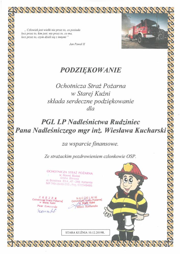 Podziękowanie OSP w Starej Kuźni za wsparcie finansowe (2019 r.)