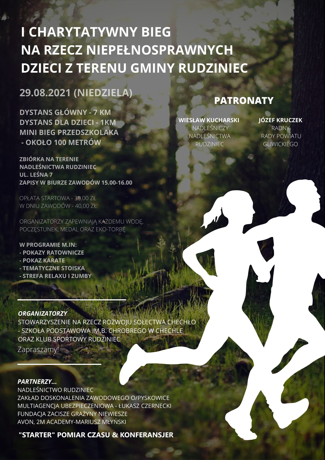 Nadleśnictwo Rudziniec serdecznie zaprasza na I CHARYTATYWNY BIEG NA RZECZ NIEPEŁNOSPRAWNYCH DZIECI Z TERENU GMINY RUDZINIEC organizowany przez „Stowarzyszenie na rzecz rozwoju sołectwa Chechło” oraz klub Sportowy RUDZINIEC. Szczegóły na plakacie.